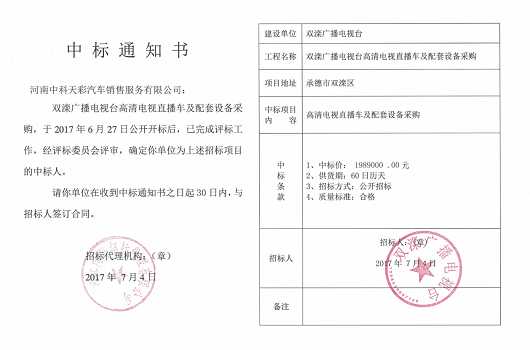 热烈祝贺中科控股李经理团队再传佳讯,一举中标(BOAOZB17118101)承德广播电视台——4K高清直播车项目。
