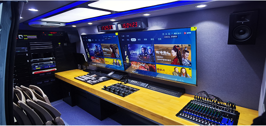 配备了5路有线摄像机光缆线路+2路无线传输。两台55寸液晶监视器,尾部配备9路线缆盘,包括音频线缆,视频线缆,摄像机光缆,电源线等多路线缆。双电源的配置保障活动的顺利进行。